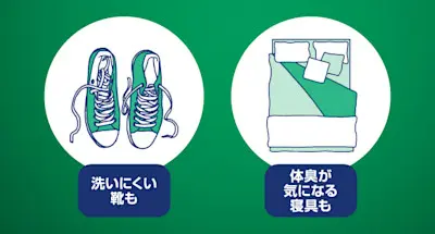 【ポイント③ 部屋干しだけでなく、ニオイが気になる寝具や靴など幅広い布製品にも】