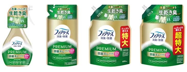 左から「ファブリーズ 消臭+除菌プレミアム 部屋干しプラス おひさまの香り 本体」、「ファブリーズ 消臭+除菌プレミアム 部屋干しプラス おひさまの香り つめかえ」、「ファブリーズ 消臭+除菌プレミアム 部屋干しプラス おひさまの香り つめかえ特大サイズ」、「ファブリーズ 消臭+除菌プレミアム 部屋干しプラス おひさまの香り つめかえ超特大サイズ」