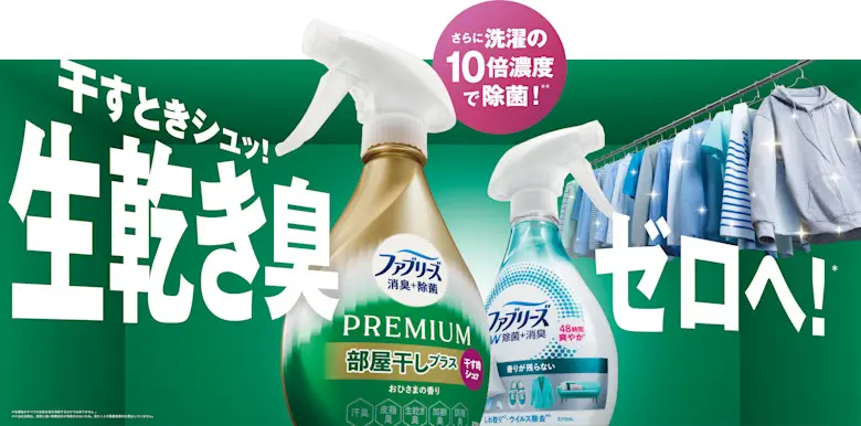今回発売する「ファブリーズ 消臭+除菌プレミアム 部屋干しプラス」は、部屋干し時に洗濯物へスプレーするという新しい使い方を提案。干すときにシュッとするだけで生乾き臭を消臭(*1)し、快適な部屋干し習慣をサポートします。