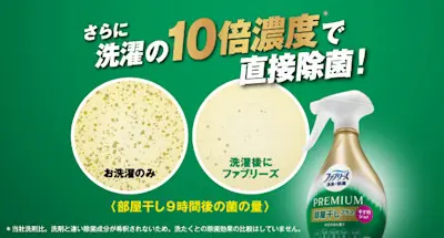 一般的な洗濯洗剤では洗濯時に除菌成分が水で希釈されますが、「ファブリーズ 消臭+除菌プレミアム 部屋干しプラス」は、衣類に直接スプレーすることが可能です。そのため、洗濯洗剤と比べて約10倍の濃度(*3)で衣類の菌に直接働きかけることができます。