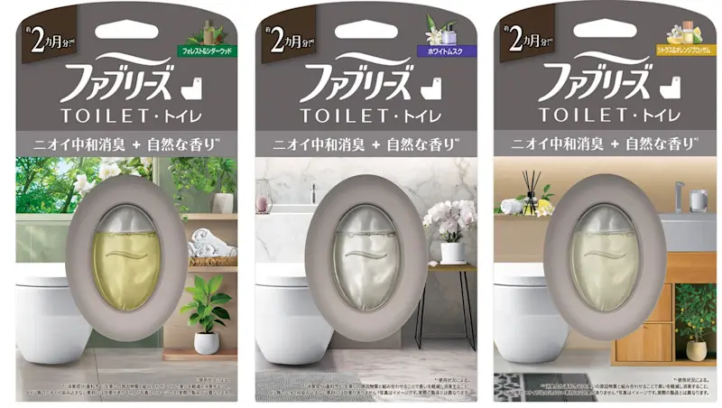 「ファブリーズ 中和消臭(*1)+自然な香り」は、トイレ用と玄関用の2タイプを展開します。トイレ用は「フォレスト&シダーウッド」「ホワイトムスク」「シトラス&オレンジブロッサム」の3つの香りをラインアップ。玄関用は「フォレスト&シダーウッド」「ホワイトムスク」の2つの香りで展開します。また、車用からは、自然な香りを楽しめる「車用 ファブリーズ Nature Drive」シリーズとして、「フォレストミスト」「ホワイトムスク」「オーシャンサボン」の3種類を発売します。