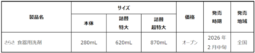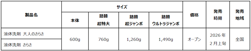 P&Gジャパン合同会社(本社:神戸市)は、無添加(*1)衣料用洗剤・柔軟剤ブランド『さらさ』から、衣料用洗剤・食器用洗剤の2つのカテゴリから新製品を発売いたします。衣料用洗剤は、衣類と肌の摩擦を軽減し、大人の乾燥肌を優しく包み込む「衣料用洗剤 大人のさらさ」を新発売いたします。さらに、「さらさ 食器用洗剤」も新登場。デリケートな手肌を考えた処方なのに、食器用洗剤のジョイと共同開発で、油汚れもスッキリ落とします。「衣料用洗剤 大人のさらさ」は2026年2月上旬、「さらさ 食器用洗剤」は2026年2月中旬より全国で発売開始いたします。