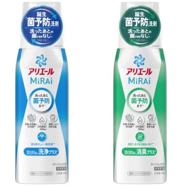 左から:「アリエール MiRAi 漂白剤級の洗浄プラス(注5)」「アリエール MiRAi 漂白剤級の消臭プラス(注6)」